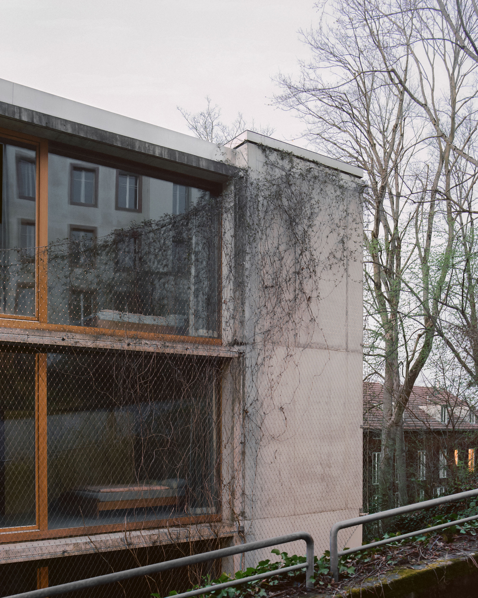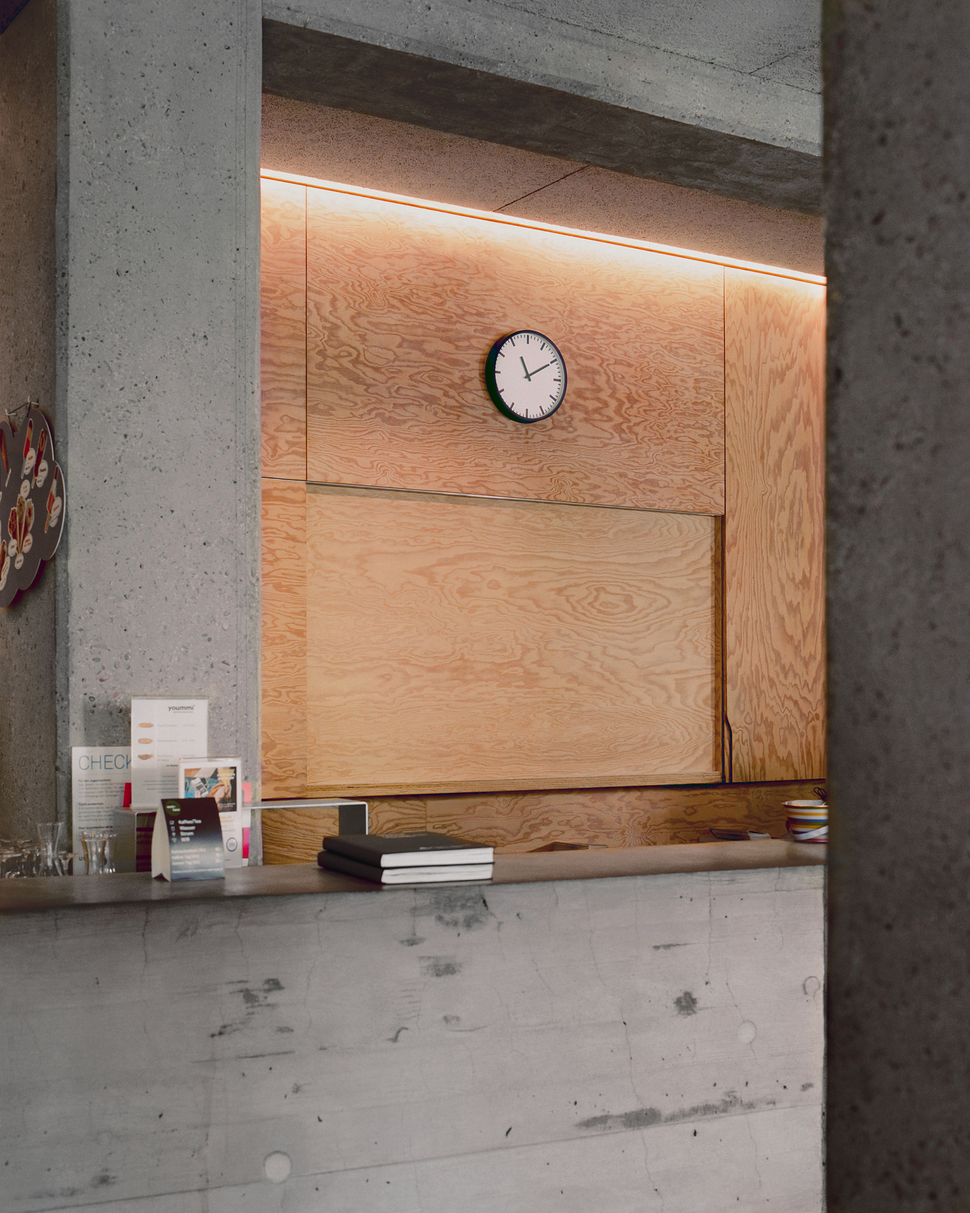 Open and airy, the brutalist-style ground level reminds of the silk factory with its vast open spaces. Here, the architects used exposed concrete generously, including for the reception desk, walls and ceilings. Likewise, the hotel‘s rooms feature textured concrete surfaces. Downstairs, the team exposed the original structure, with the vaults of the former silk dye area taking center stage. Huge, floor-to-ceiling windows bathe the rooms and common areas in natural light. New openings also frame views towards the St. Alban church and a nearby forest. The extension houses 21 spacious rooms that open to balconies. Guests also have access to a common porch outdoors.